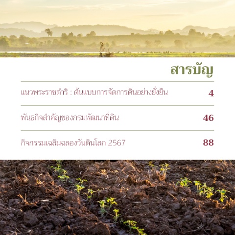 สารบัญ แนวพระราชดำำาริ : ต้้นแบบการจััดำการดำินอย่่างย่ั�งย่ืน 4 พันธกิจัสำำาคััญของกรมพัฒนาที่่�ดำิน 46 กิจักรรมเฉลิมฉลองวันดำินโลก 2567 88